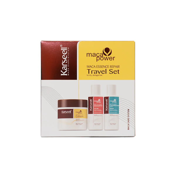 El set de viaje **Karseell Maca Essence** concentra el poder nutritivo de la maca para reparar, hidratar y fortalecer tu cabello en tres pasos compactos: **mascarilla**, **shampoo** y **acondicionador**. Ideal para valija, gym o carry-on.